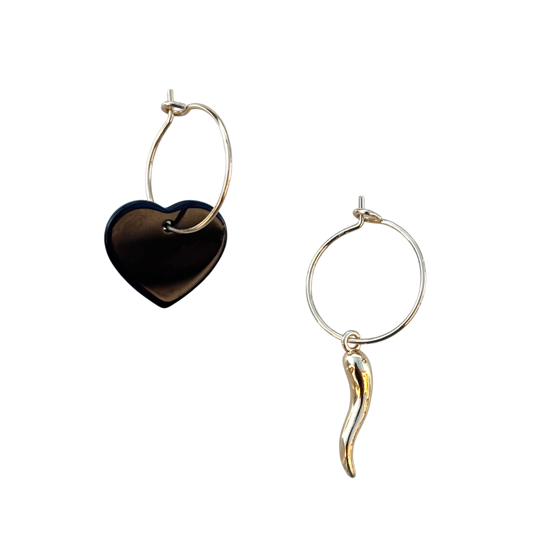Créoles en plaqué or ornées de deux pendentifs : un coeur en onyx et d’une corne en plaqué or de 15 mm.